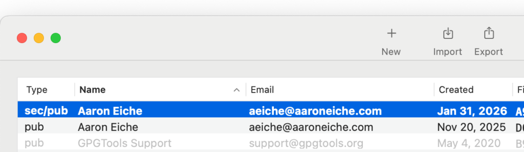 When I was copying data off of the Linux drive, I was trying to be really careful to make sure that I got everything. I explicitly exported my GPG keys so I could easily import them into my new setup.